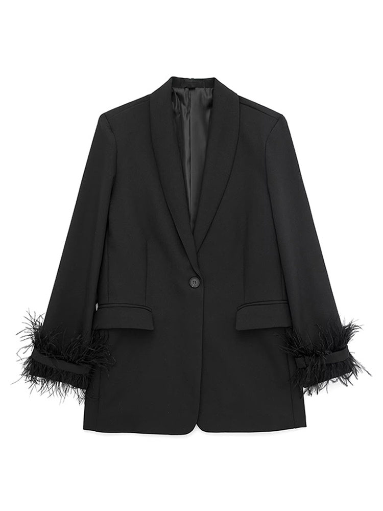 Elevate your style with this chic feather-trimmed blazer. Crafted from a smooth and luxurious polyester blend, this jacket offers a stylish and sophisticated look that's perfect for adding a touch of elegance to any outfit. The classic blazer design features a notch lapel collar, a single button closure, and a relaxed fit, making it ideal for creating a chic and polished vibe. The feather trim adds a touch of whimsy and texture, while the smooth fabric creates a comfortable and stylish look.