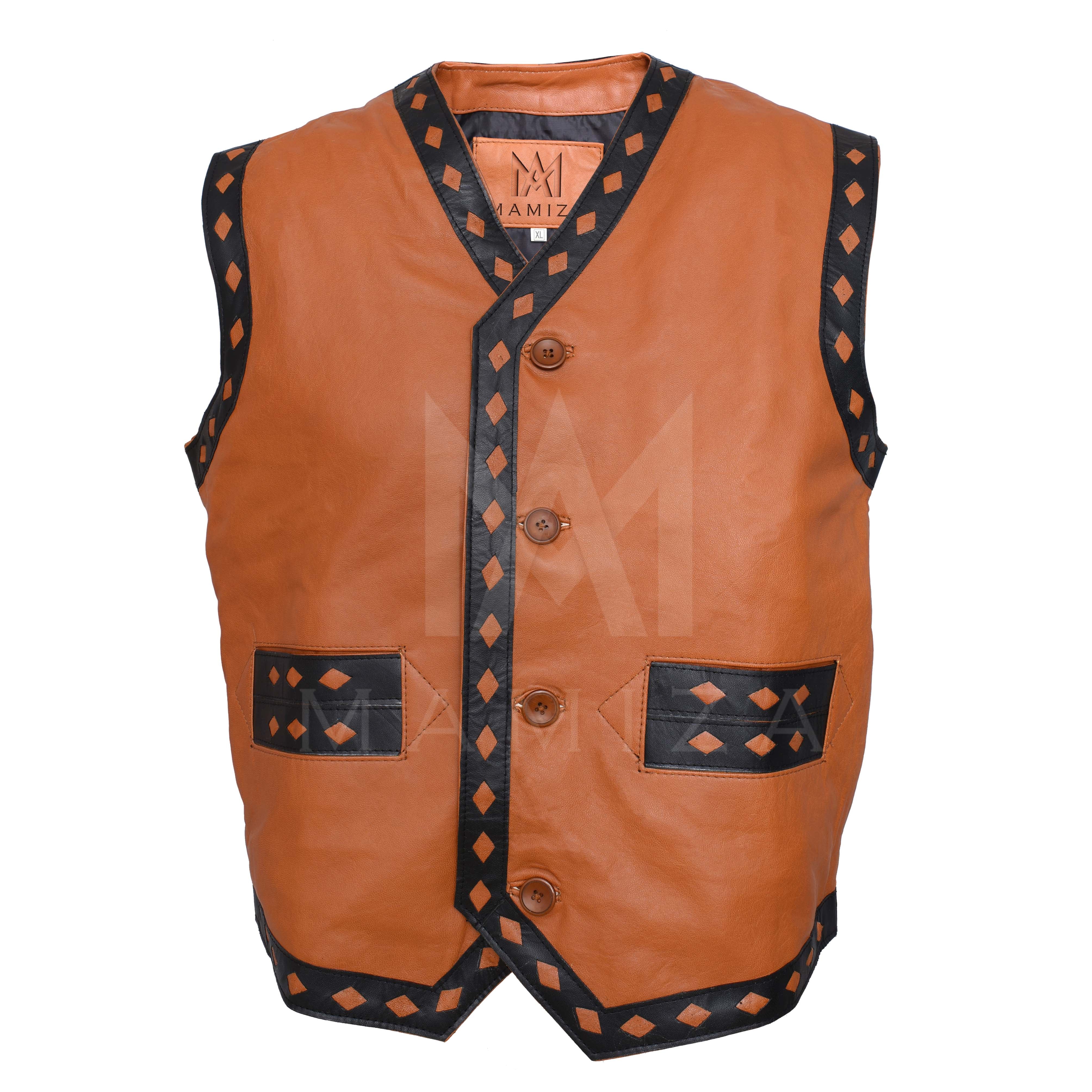 Enhance your wardrobe with our Leather Vests. Available in three striking colors—black, tan, and burgundy—these vests feature unique contrasting trim and button details, making them perfect for adding a touch of western flair to any outfit. Crafted from high-quality leather, they are designed for both style and comfort.